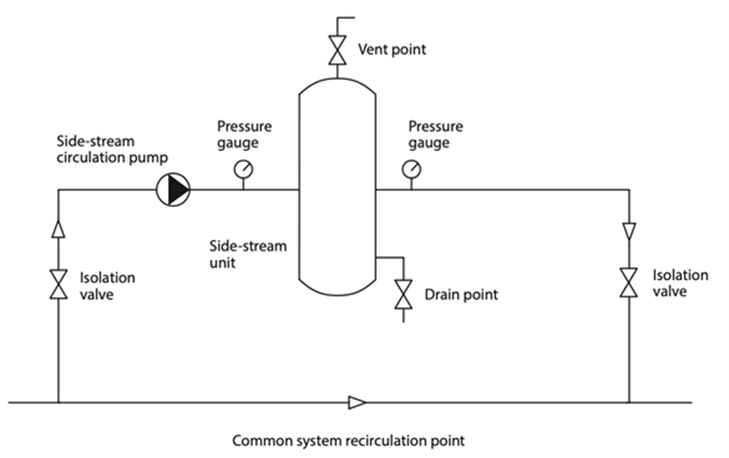 A number of systems have side-stream filtration included at the design stage in order to safeguard some of the issues we have highlighted above. Such equipment is simple easy to install and has a simple process of solids removal. Side stream filters are designed to constantly pass 5-15% of the circulating water through a filter housing (see diagram) resulting in the total system volume being filtered 2 to 3 times every 24 hours.