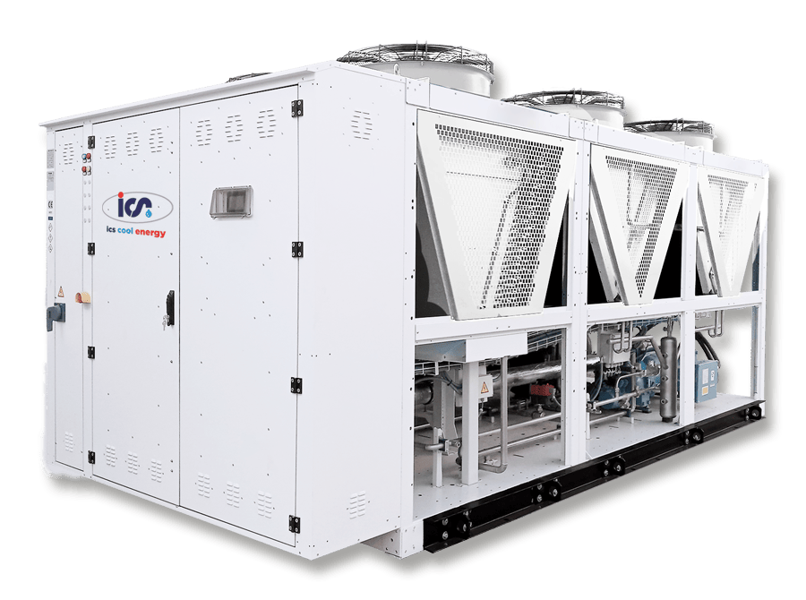 The i-Chiller Process LTn chiller is an industrial refrigeration ammonia air-cooled chiller for outdoor installation specifically designed for deep freezing applications with an air-cooled chiller.