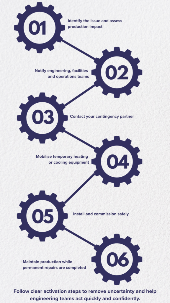 A clear activation process helps manufacturers respond quickly to system failures and minimise the risk of unplanned downtime. Engaging a specialist provider such as ICS Cool Energy for your contingency plan enables rapid access to temporary heating and cooling equipment, supported by technical expertise and emergency response.